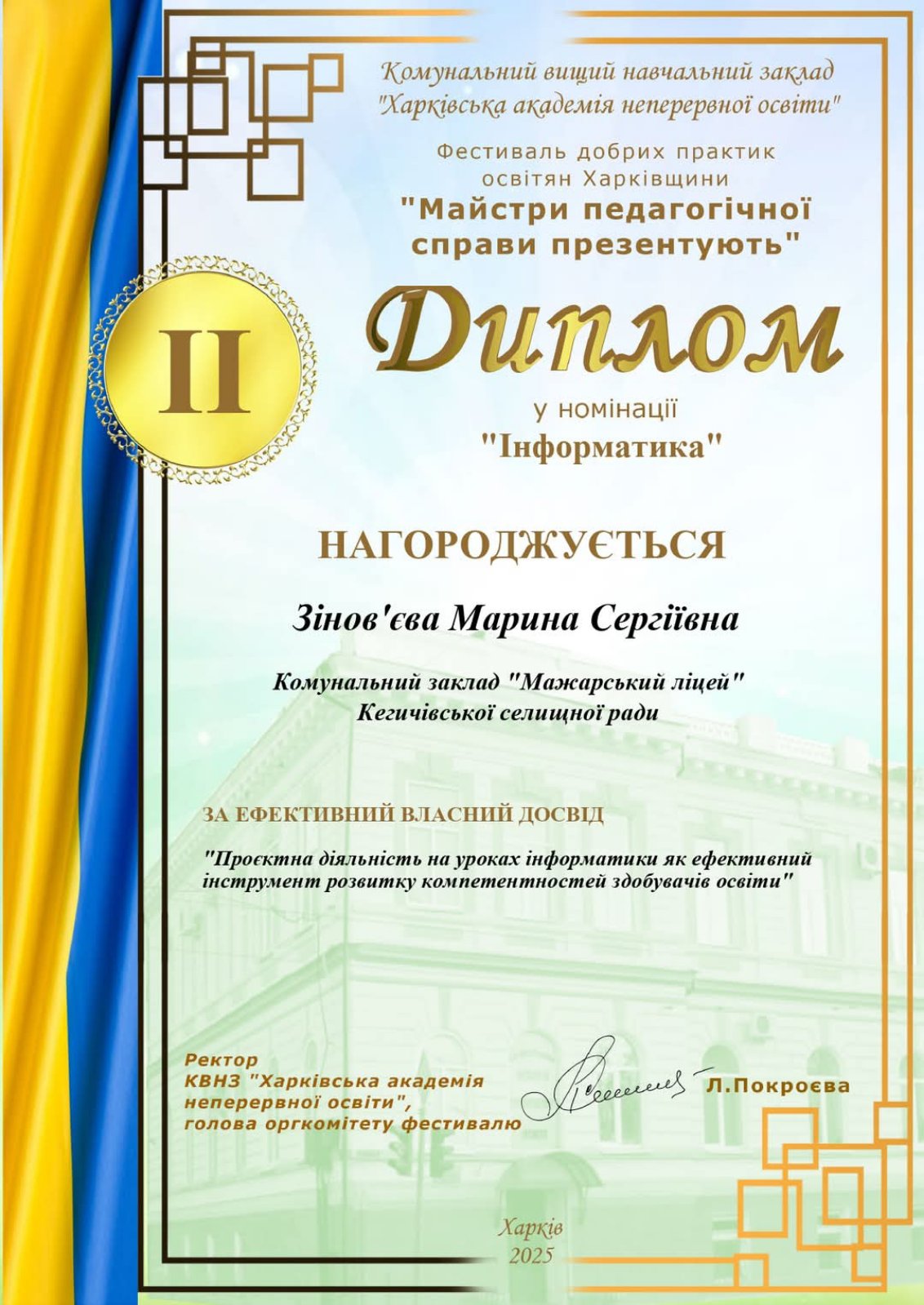 Зінов'єва Марина Сергіївна - переможець VІІІ Фестивалю «добрих практик» освітян Харківщини «Майстри педагогічної справи презентують» (номінація - "Інформатика").