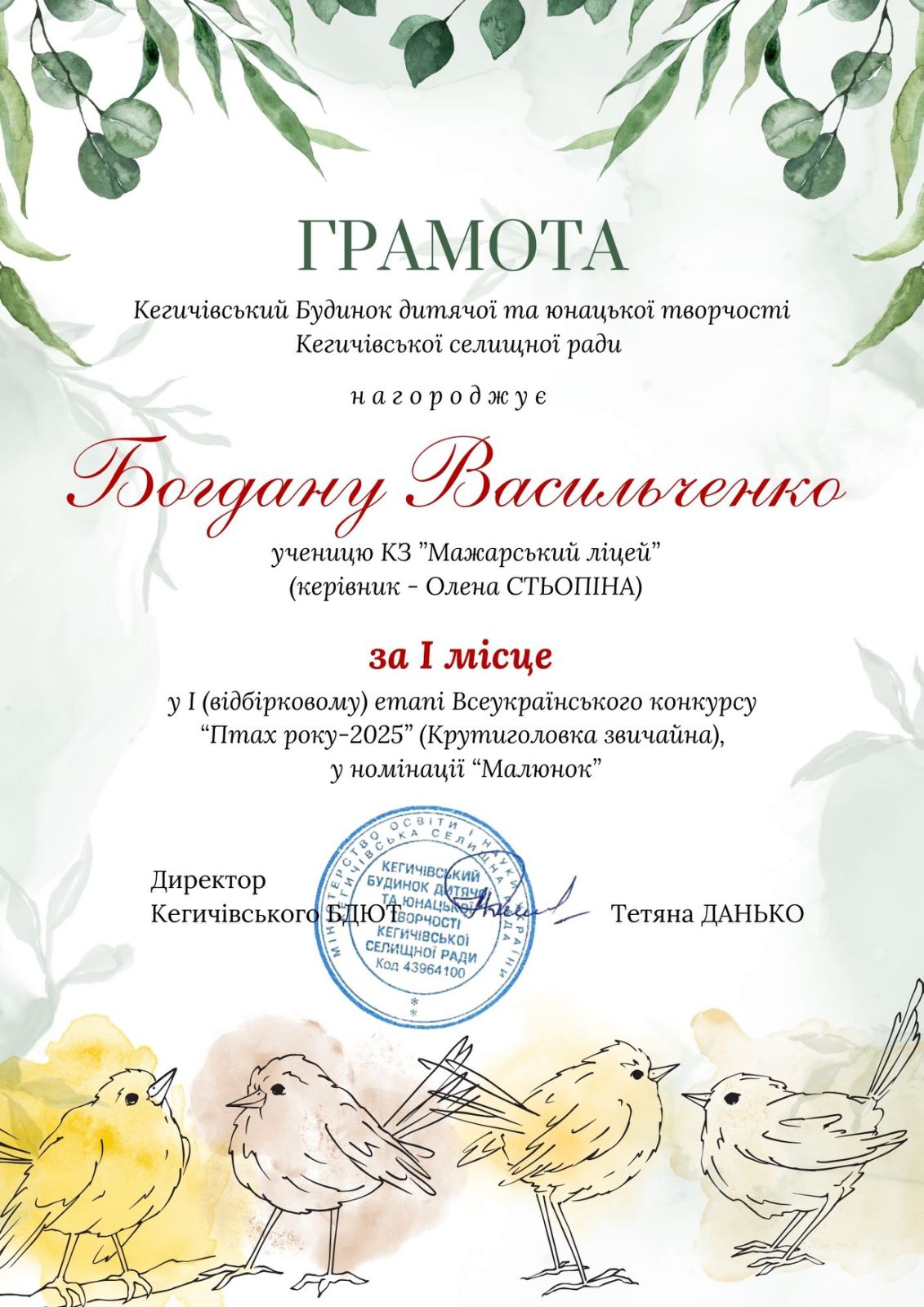 Щиро вітаємо наших талановитих учениць — Богдану Васильченко та Софію Максименко — із блискучою перемогою. Вони вибороли І місце у І (відбірковому) етапі Всеукраїнського конкурсу «Птах року-2025» (Крутиголовка звичайна)!