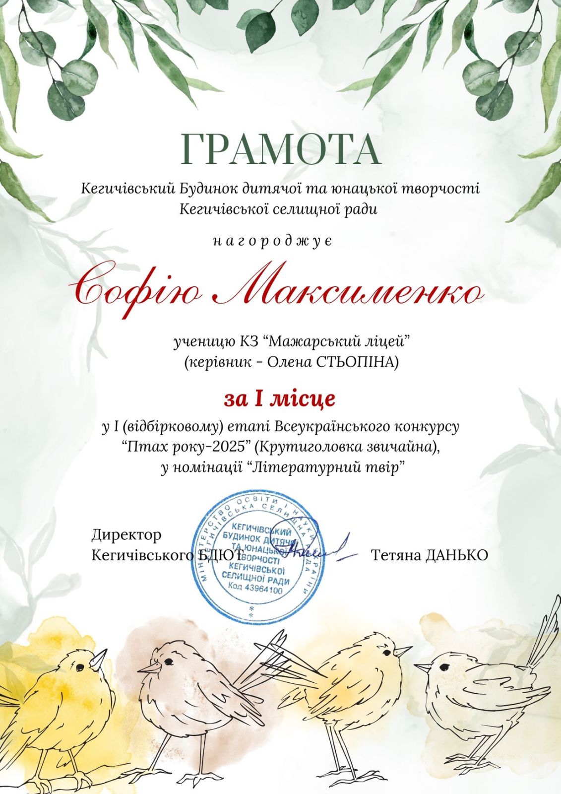 Богдану Васильченко та Софію Максименко — І місце у І (відбірковому) етапі Всеукраїнського конкурсу «Птах року-2025»