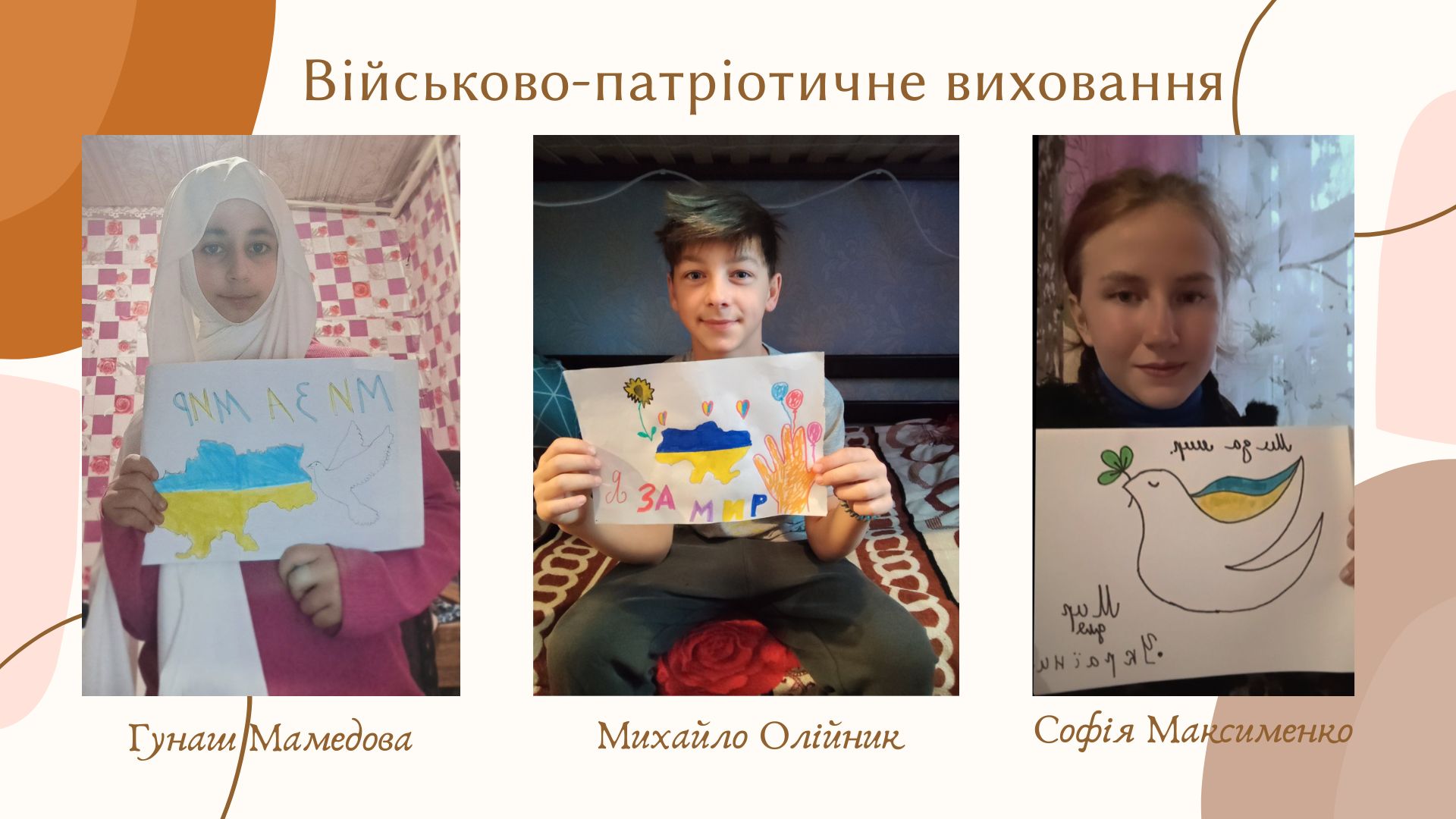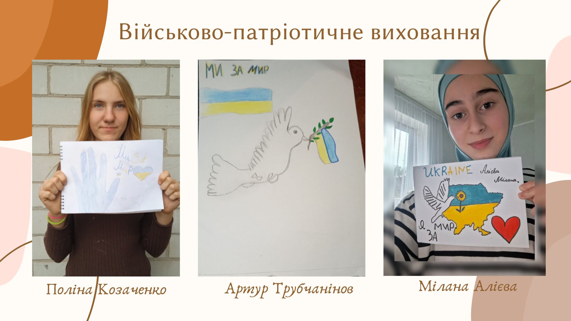 Справжнє військово-патріотичне виховання — це не лише знання історії, а й активна громадянська позиція, що поєднує шану до минулого із будуванням майбутнього. Учні взяли участь у конкурсі малюнків "Ми — за мир", де через мистецтво висловили свою глибоку надію на Перемогу та мирне життя.
